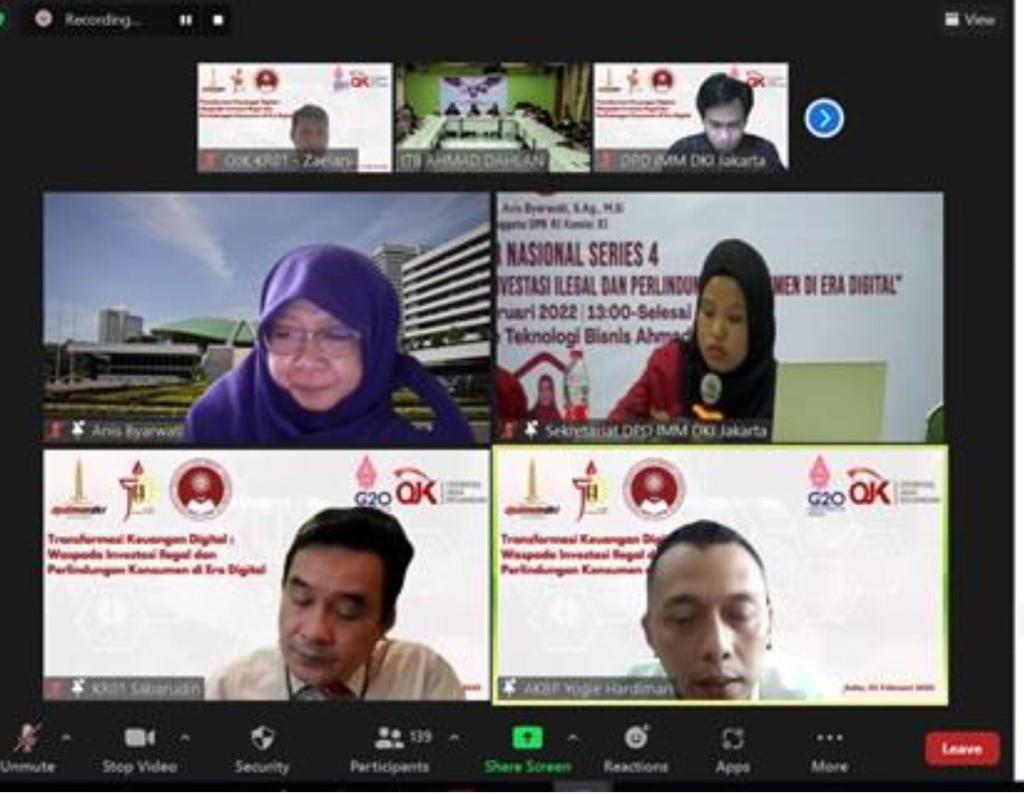 Mediakawasan.co.id, Jakarta- Kantor OJK Regional 1 DKI Jakarta dan Banten (KR01) berkolaborasi bersama Dewan Pimpinan Pusat Ikatan Mahasiswa Muhammadiyah (DPP IMM) Jakarta dalam acara Webinar Nasional dengan tema Transformasi Keuangan Digital: Waspada Investasi Ilegal dan Perlindungan Konsumen di Era Digital yang dihadiri secara hybrid (virtual dan tatap muka) oleh 223 peserta mahasiswa dan masyarakat umum.