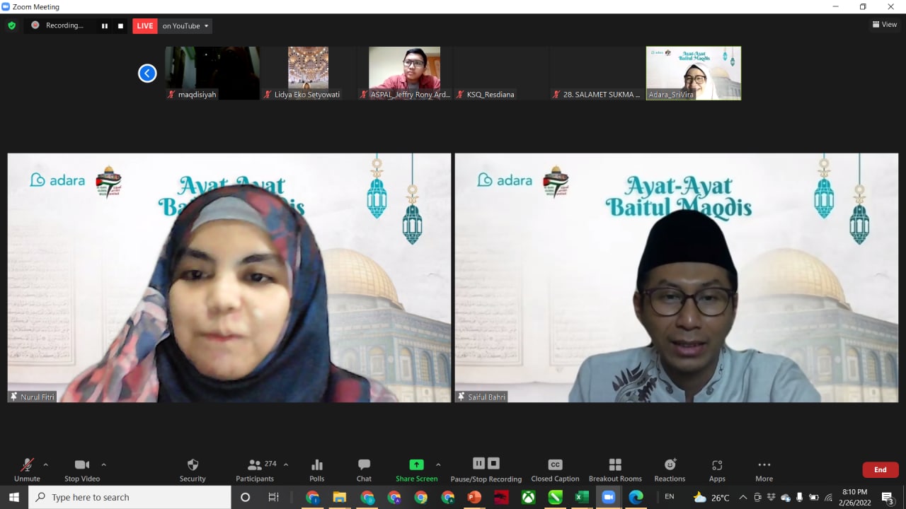 Kajian Tafsir Ayat-Ayat Baitul Maqdis yang telah dilaksanakan pada Sabtu, 26 Februari lalu diisi oleh Ustadz Dr. Saiful Bahri dan membahas tafsir ayat-ayat Al Qur’an tentang Baitul Maqdis. Acara yang berlangsung secara virtual melalui zoom meeting dan kanal youtube Adara tersebut, dibuka dengan sambutan dari Direktur Eksekutif Adara, Sri Vira Chandra. Dalam sambutannya, Sri Vira Chandra mengatakan, “Jikalau Nabi Muhammad SAW adalah hamba yang dipilih Allah dalam peristiwa Isra Mi’raj, maka sepatutnya kita bersyukur bahwa kita termasuk bagian dari hamba-Nya yang telah dipilih untuk memperjuangkan dan mempedulikan pusat keberkahan umat Islam itu.“ Selama dua jam, Kajian Tafsir Ayat-Ayat Baitul Maqdis diikuti oleh sekitar 520 orang partisipan melalui zoom dan YouTube.