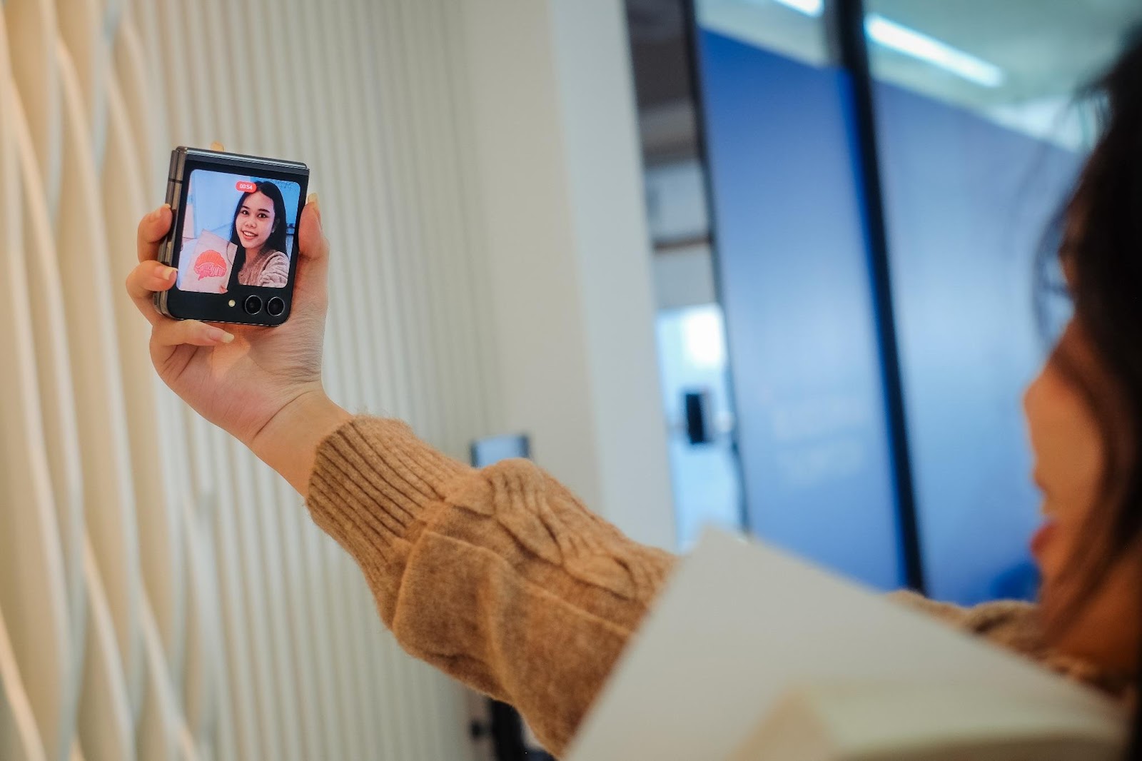 Nah, Galaxy Z Flip5 menawarkan keunggulan lainnya dari HP lipat, yakni aksesibilitas yang lebih fleksibel ketika dipakai membuat konten sehari-hari. Dengan Galaxy Z Flip5, kamu bisa merekam langsung saat perangkat terlipat dan melihat dengan jelas tampilan preview dari kamera berkat Flex Window yang lapang. Kamu pun bisa menggenggamnya dengan nyaman karena ukuran HP lipat ini compact banget, jadi tangan kamu tak akan pegal dan bisa memastikan angle pengambilan video konsisten di setiap footage yang diambil dengan lebih mudah. Bagusnya lagi, kamu akan mendapatkan hasil video yang maksimal karena kamu akan menggunakan kamera belakang Galaxy Z Flip5 yang jernih banget dari Dual 12MP Pro-grade Camera yang mendukung kualitas perekaman hingga 4K pada 60fps.