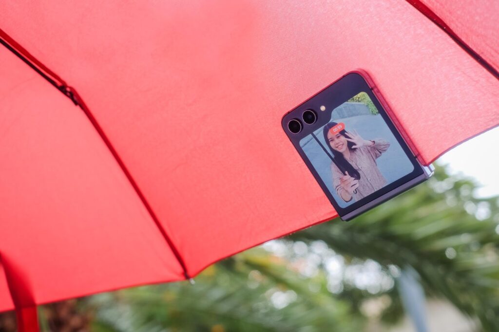 Berkat keunggulan tersebut, kamu bisa menciptakan video transisi unik dengan explore berbagai angle menarik yang mungkin tak terpikir sebelumnya ketika menggunakan smartphone biasa. Misalnya, kamu bisa menjepitkan Galaxy Z Flip5 ke payung yang terbuka untuk bikin video transisi outfit atau video transisi bareng teman. Dengan hinge yang kokoh dan memastikan perangkat terlipat rapat dengan kuat, kamu tak perlu perangkat akan mudah bergeser atau jatuh ketika dijepitkan untuk menciptakan video transisi yang smooth dan berkualitas tinggi.