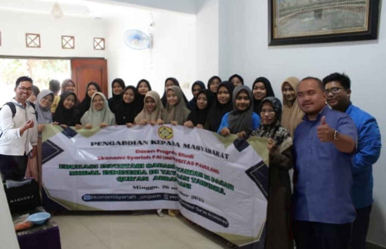 Mediakawasan.co.id, Tangerang Selatan – Dosen Prodi Ekonomi Syariah Universitas Pamulang melaksanakan Pengabdian Kepada Masyarakat (PKM) dengan tema “Investasi Saham Syariah di Pasar Modal Indonesia” pada santri Yayasan Tahfidzul Qur’an Ar- Rahmani Ciputat. Kegiatan yang diselenggarakan di Aula Yayasan Y.T.Q. Ar Rahmani pada Minggu, 26 November 2023 dan 3 Desember 2023. Kegiatan PKM ini, dilakukan sebagai jawaban atas permintaan secara langsung oleh santri yang penasaran dengan hukum atau kebolehan investasi saham secara prinsip syariat.