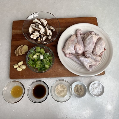 3. Persiapkan Bahan Lain: Potong-potong jamur shitake, jahe, dan bawang pre dan geprek 2 siung bawang putih.