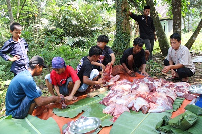 Pembagian daging kurban tidak hanya untuk warga Kampung Kadulisung. Koordinator FOI Pandeglang, Priyono, menjelaskan bahwa ada 500 lebih warga yang mendapatkan manfaat dari program QHP #10 ini termasuk anak-anak dan lansia. “Daging sapi dan kambing didistribusikan ke 6 kampung, Kadulisung, Kadusirung, Cigajah, Kadukeruk, Cikaroya dan Cigendis. Masyarakat Kampung Kadulisung antusias terlibat dalam gotong royong mulai dari persiapan, penyembelihan, hingga pembagian daging kurban ke penerima manfaat.” Meski tanpa plastik dan hanya menggunakan takir, wadah dari daun pisang, masyarakat bersemangat berbaris dengan rapi untuk mendapatkan jatah daging kurban. QHP #10 ini diharapkan dapat menjadi perwujudan aksi pemerataan akses pangan ke berbagai wilayah termasuk hingga pelosok desa. Kerap kali, hasil kurban hanya bisa dirasakan oleh mereka yang mampu secara finansial, terutama di wilayah perkotaan. Namun, kegiatan QHP ini dapat menjembatani ketimpangan akses pangan yang berlebih untuk mewujudkan keadilan pangan terutama bagi mereka yang tinggal di pelosok. (Red/rlls)