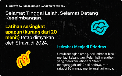 Strava juga mengungkapkan bahwa fokus pada keseimbangan ini tidak menghambat progres olahraga, dengan 72% target lari pada 2024 tetap tercapai, begitu juga dengan 77% target bersepeda. Strava juga mencatat peningkatan jumlah marathon, ultra-marathon, dan century ride sebesar 9% di tahun ini.