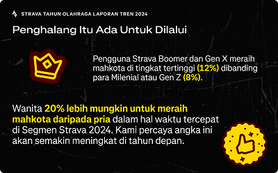 - Wanita yang memimpin: Data global kami menunjukkan bahwa wanita 20% lebih mungkin untuk meraih mahkota di Strava pada 2024 daripada pria.