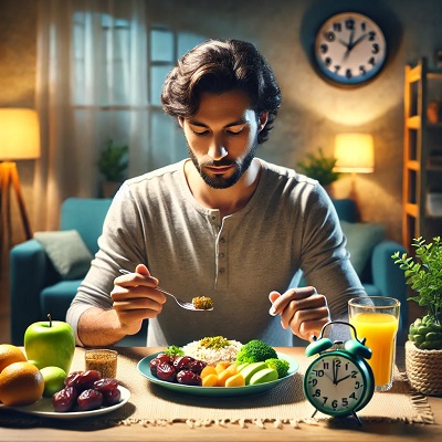 Pilih makanan yang tinggi serat dan protein, seperti kurma, buah-buahan, sayuran, dan biji-bijian.