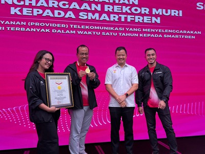 Mediakawasan.co.id, Jakarta – SMARTFREN berhasil mencatatkan rekor nasional sebagai “Penyedia Layanan Telekomunikasi yang Menyelenggarakan Ajang Lari Terbanyak dalam Waktu Satu Tahun” melalui program SMARTFREN Fun Run 2025. Dalam kurun satu tahun, SMARTFREN sukses menggelar rangkaian kegiatan fun run di 22 kota di seluruh Indonesia, menjangkau lebih dari 15 ribu peserta dari berbagai usia dan latar belakang. Penyerahan penghargaan dilakukan di kantor XLSMART Tower, Jakarta oleh Wakil Direktur MURI, Osmar Susilo dan diterima oleh Chief Marketing Officer SMARTFREN XLSMART, Sukaca Purwokardjono. Senin (3/11)